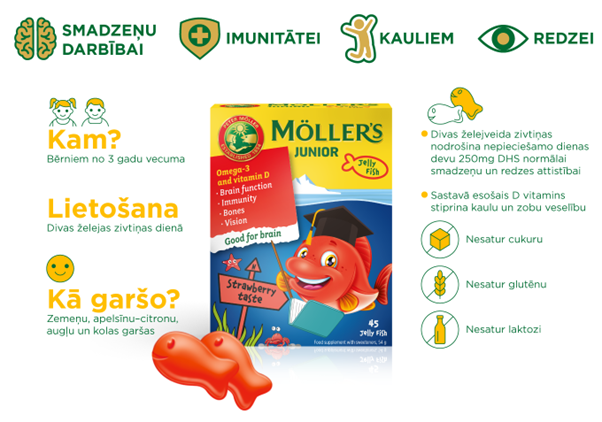 Tomēr realitāte ir tāda, ka ne visi bērni ēd zivis, tāpēc ērtākais veids, kā papildināt bērna uzturu ir izvēloties Norvēģijā ražotās zivju eļļas želejas zivtiņas Möller’s Junior. Tās satur bērnam optimālu dienas devu Omega-3 taukskābes DHS un EPS - 370mg, kā arī bērnam drošu D vitamīna devu - 400IU, kas ir nozīmīgs imūnsistēmas normālai darbībai un kaulu veselībai.