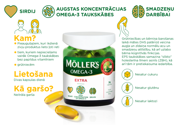 Vecākiem jāņem vērā, ka Omega-3 taukskābes ir būtiskas bērna smadzeņu attītībai jau prenatālajā periodā, tāpēc ir nozīmīgi, ka grūtnieces uzņem augstāku devu Omega-3 taukskābes, kas nodrošina gan māmiņas, gan mazuļa vajadzības. Möller’s Extra zivju eļļas kapsulas satur augstas koncentācijas Omega-3 taukskābes, kas ir ērtas ikdienas lietošanā un nodrošina optimālu DHS un EPS taukskābju daudzumu grūtniecības laikā.