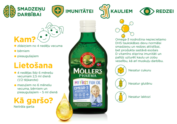 Pēc mazulīša nākšanas pasaulē, ieteicams izvēlēties zīdaiņiem piemērotu zivju eļļu uztura papildināšanai. Möller’s Mana Pirmā zivju eļļa ir īpaši tīra un kvalitatīva mencu aknu eļļa, kas piemērota lietošanai zīdaiņiem jau no 4 nedēļu vecuma, kad strauji turpinās smadzeņu attīstība. Tā satur arī dabīgo D vitamīnu, līdz ar to papildus D vitamīns nav nepieciešams.