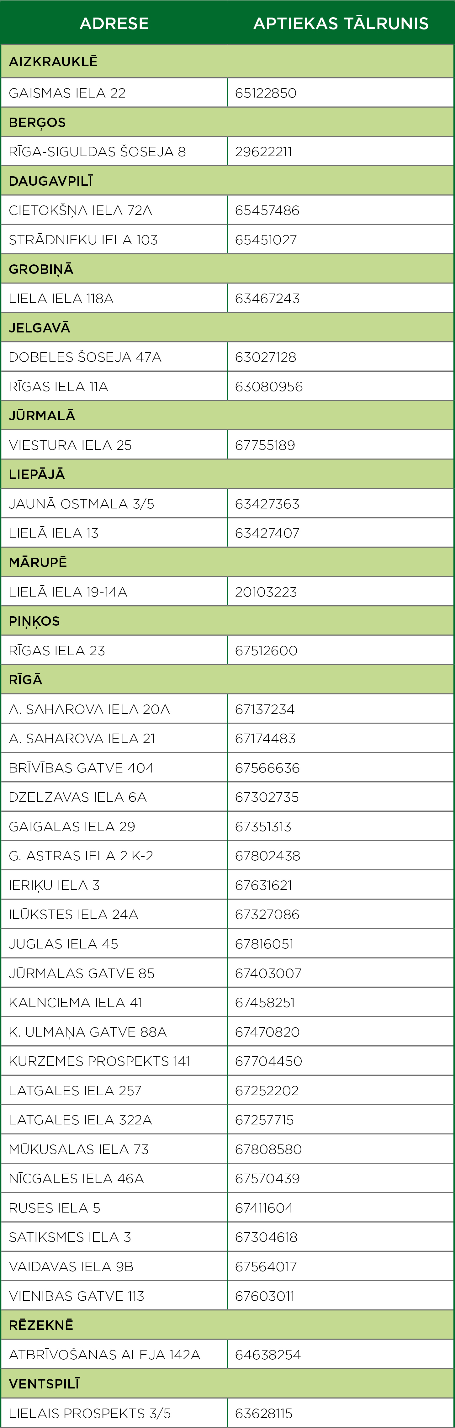 Pakalpojumu nodrošinām sekojošās aptiekās: